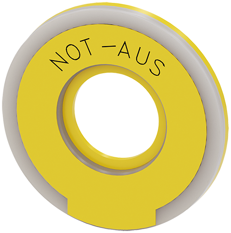 PLACA DE FONDO REDONDA PARA PULSADOR SETA PARO EMERG., AMARILLA, ILUMINADA, GROSOR 5MM, DIAMETRO EXTERIOR 75MM, DIAMETRO INTERIOR 23MM, CON INSCRIPCION: NOT-AUS