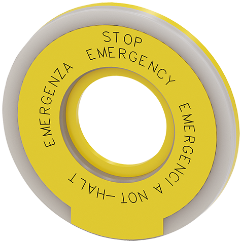 PLACA DE FONDO REDONDA PARA PULSADOR SETA PARO EMERG., AMARILLA, ILUMINADA, GROSOR 5MM, DIAMETRO EXTERIOR75MM, DIAMETRO INTERIOR 23MM, CON INSCRIPCION: PARO DE EMERGENCIA 4 IDIOMAS: DE,EN,IT,ES
