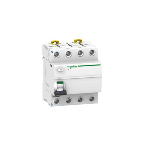 Interruptor diferencial iID, 4P, 25A, 300mA, clase AC, IP20, 50/60 Hz, posición de neutro en la izquierda, retardo de la protección contra fugas a tierra instantáneo, control por maneta, indicador de disparo, montaje embarrado tipo peine extraíble instalado, soporte en carril DIN, longitud de cable descubierto de 14mm (arriba o abajo), 91x72x73,5mm, 0,37kg, Blanco. Normas: IEC 61008-1, EN 61008-1.