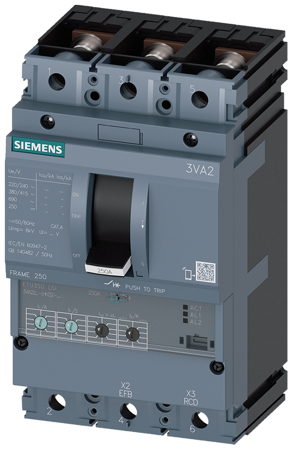 INTERRUPTOR AUTOM. 3VA2 IEC TAMANO 250 CLASE DE PODER DE CORTE C ICU=110KA @ 415 V 3 POLOS, PROTEC. DISTRIBUCIONES ETU350, LSI, IN=250A PROTECCION DE SOBRECARGA IR=100A …250A PROTECCION DE CORTOCIRCUITO ISD=1,5… 10 X IR, II=10 X IN CONEX. POR PLETINA Y TORNILLO