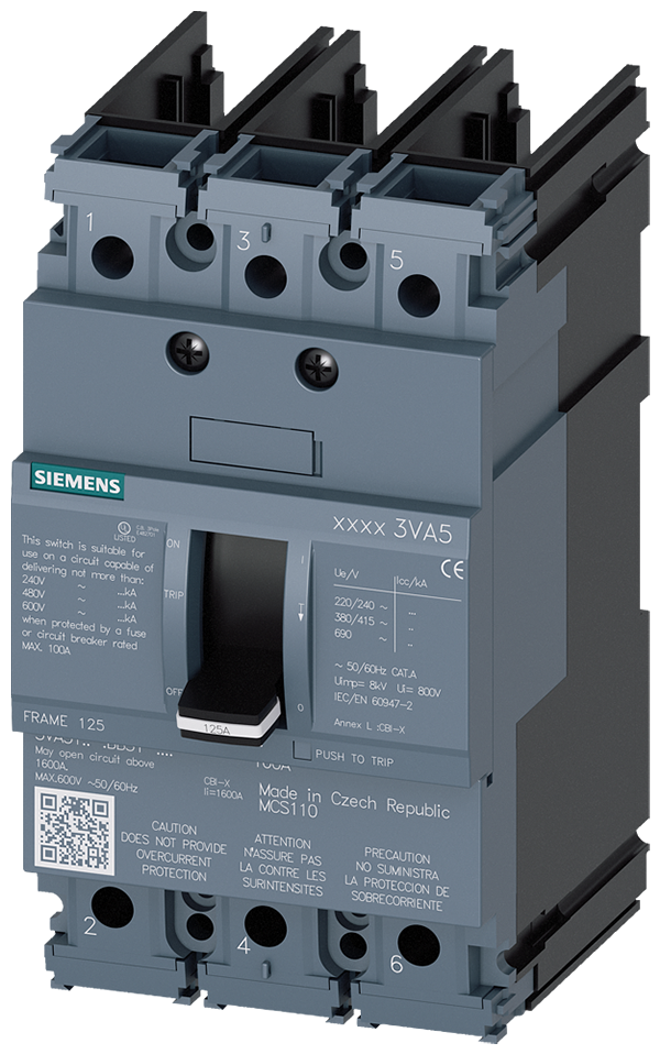 INTERRUP. CAJA MOLDEADA 3VA5 UL tamaño 125 PODER CORTE MAX. EN CORTOCIRC. 65KA @ 480Y/277 V 3 POLOS, PROTEC. DISTRIBUCIONES MCS110, IN=100A SIN PROTECCION DE SOBRECARGA PROTECCION INTRINSECA II=16 X IN SIN ELEMENT. DE CONEXION
