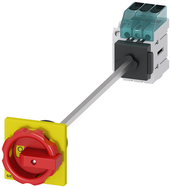INTERR.PPAL 3LD3 3 POLOS, Iu 63A P/AC CON 400V= 22,0 kW FIJACION EN BASE CON TALADRO ÚNICO CENTRAL 22,5 mm CON ACCIONAMIENTO GIRATORIO ROJO/AMARILLO 66 x66 mm CON CONTACTOS AUXILIARES 1NA+1NC