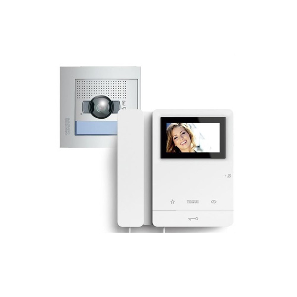 Kit de videoportero 2 HILOS para vivienda unifamiliar compuesto de monitor SERIE 8 con auricular y pantalla a color de 4,3?? para la instalación en superficie (soporte incluido) y placa exterior modular de vídeo SFERA NEW en acabado aluminio anodizado de instalación empotrada. Ampliable hasta 5 monitores o teléfonos y 2 placas exteriores o telecámaras adicionales