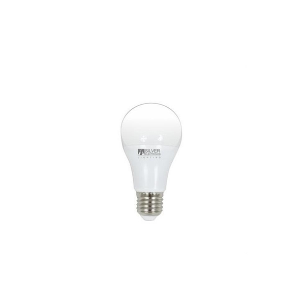 Lámpara LED estándar 10W 3000K E27, de iluminación Silver Electronics. Potencia de 10 W (Equivale a 85W de incandescencia). Base: E27. Color: 3.000 K – Luz cálida – Warm light. Duración de 25.000 horas. Lumens: 810. Voltaje de 220V. Ángulo: 180°. Altura: 106 mm. Diámetro de 60 mm. Mínima emisión frontal del calor. Ahorra un 90% en el consumo de luz. Disipa poco calor, por lo que se ahorra notoriamente en aire acondicionado. Dura 15 veces más que una bombilla clásica.