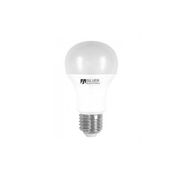 Lámpara LED estándar 15W 3000K E27, de iluminación Silver Electronics. Potencia de 15 W (Equivale a 100W de incandescencia). Base: E27. Acabado de Aluminio. Color: 3.000 K – Luz cálida – Warm light. Duración de 25.000 horas. Lumens: 1250. Voltaje de 230V. Ángulo: 180°. Altura: 121 mm. Diámetro de 60 mm. Cuerpo de aluminio para óptima disipación del calor. Mínima emisión frontal del calor. Ahorra un 90% en el consumo de luz. Disipa poco calor, por lo que se ahorra notoriamente en aire acondicionado. Dura 15 veces más que una bombilla clásica
