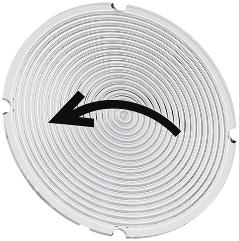PLAQUITA INTERIOR PARA PULSADORES ILUMINADOS, REDONDA, LACTEO CON LETRA NEGRA, CON SIMBOLO GRAFICO: GIRO ANTIHORARIO