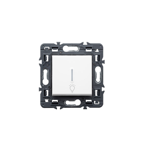 Pulsador luminoso con símbolo de lámpara 6 A – 230 V~ – Bornes automáticos – Función luminoso con lámpara LED (230 Vca – 0,15 mA) ref. 0 676 86 y función piloto con lámpara LED (230 Vca – 3 mA) ref. 0 676 85 – Blanco