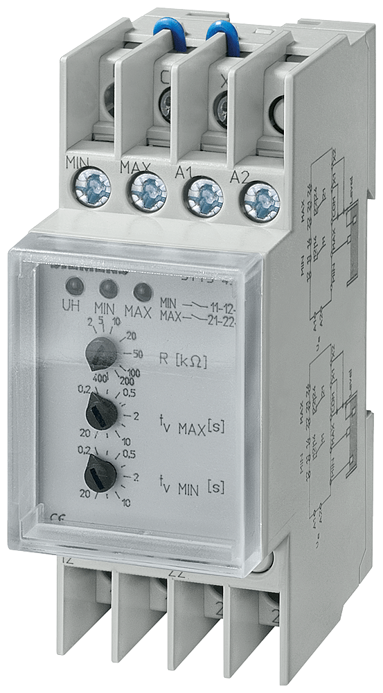 Relé de nivel >N<, para vigilancia del nivel máximo/mínimo de líquidos, programable mediante puente X1-COM, 2 módulos, 230 V, 4 A, 2 conmutadores