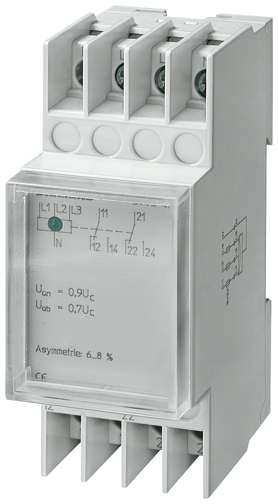 Relé de tensión mínima >N<, para vigilancia de 1, 2 ó 3 fases respecto a N, 1 módulo, Udesc.=0,85xUc, Ucon.=0,95xUc, con reconocimiento de asimetría y vigilancia del neutro, 230/400 V, 4 A, 1 conmutador
