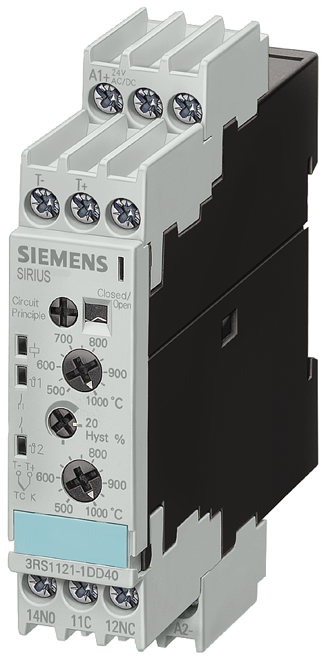 SIRIUS Rele de vigilancia de temperatura termopar tipo J, rebase exceso 2 umbrales, ancho 22,5 mm 0~C – 200~C, 24V AC/DC 1 NA+1 CNM, circuito NA y NC conexión por resorte