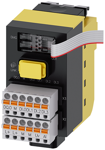 SIRIUS ACT con PROFINET: Módulo de interfaz de seguridad, 24 V DC, módulo de memoria incluido with 4 DI, 1 DQ (DC 24 V), 1 AI (10-Bit A/D resolution). Bornes de resorte.