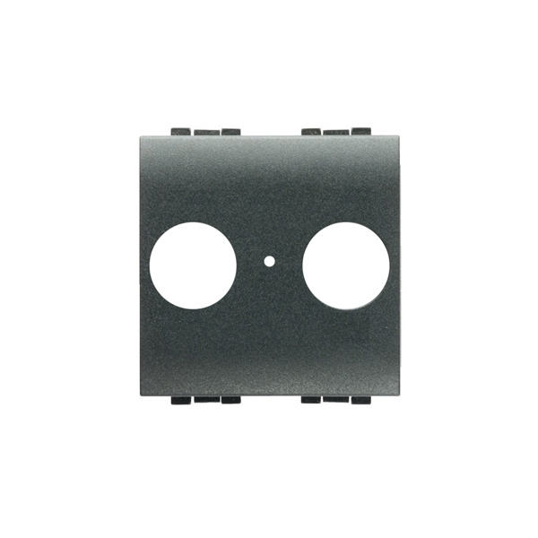 Frontal TV/R-SAT universal Livinglight, 2 módulos, color antracita, con un ancho de 155m, alto de 133mm, largo de 125mm y un peso de 260gr. Permiten la instalación en las principales bases de televisión del mercado, fijación por la parte central mediante tornillo frontal.